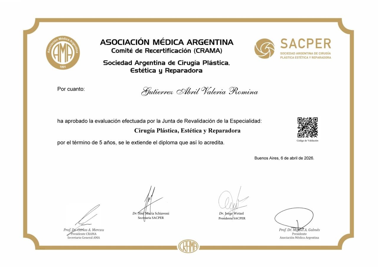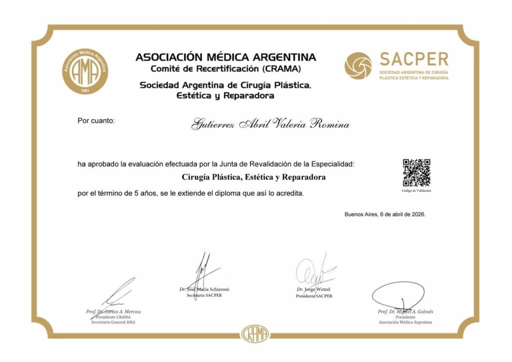 El diploma, fechado el 6 de abril de 2026, fue otorgado por el Comité de Recertificación de la Asociación Médica Argentina (CRAMA) junto con la Sociedad Argentina de Cirugía Plástica, Estética y Reparadora (SACPER).