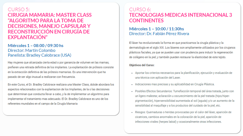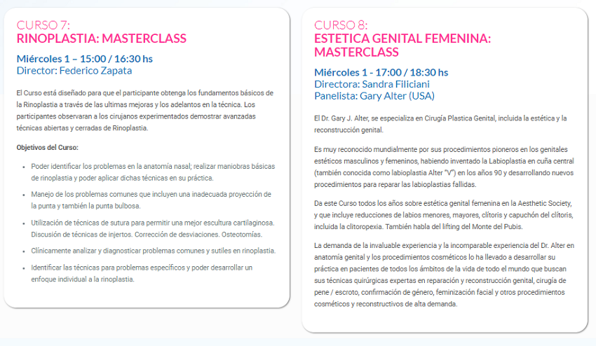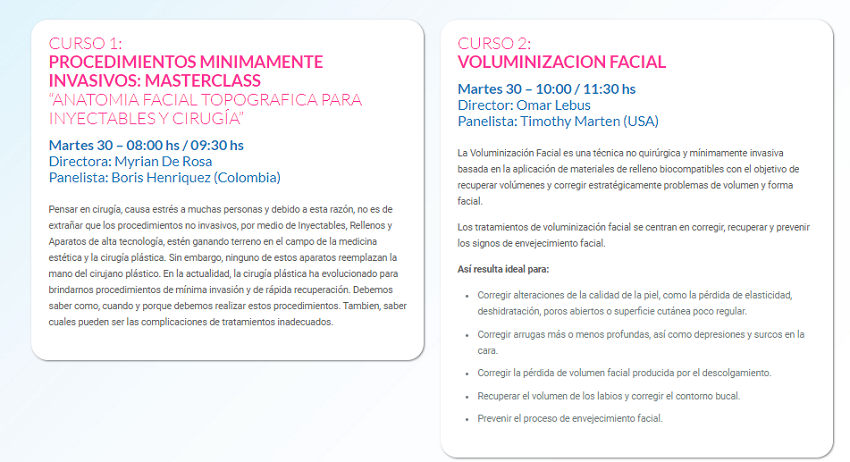 El martes 30 de noviembre y el 1° de diciembre se desarrollarán los ochos cursos previstos que tendrán una duración de noventa minutos y estarán dirigidos por “cirujanos plásticos de reconocida trayectoria y experiencia que, de forma conjunta con la participación de los invitados extranjeros, volcarán todos sus conocimientos y tips en los variados temas a desarrollar”, indicaron desde la organización del evento.