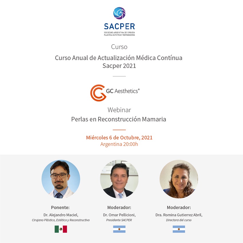 Desde las 20 horas, la jornada tendrá el próximo miércoles una conferencia virtual, titulada “Perlas en Reconstrucción Mamaria”, que contará con la exposición del doctor Alejandro Maciel (México), cirujano plástico, estético y reconstructivo, y con la moderación del doctor Omar Pellicioni, presidente de la SACPER, y de Gutiérrez Abril, directora del curso.